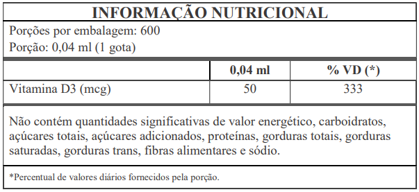 INGREDIENTES: Triglicerídeos de cadeia média (TCM), Vitamina D3 (colecalciferol) e antioxidante DL-alfa-tocoferol. NÃO CONTÉM GLÚTEN.